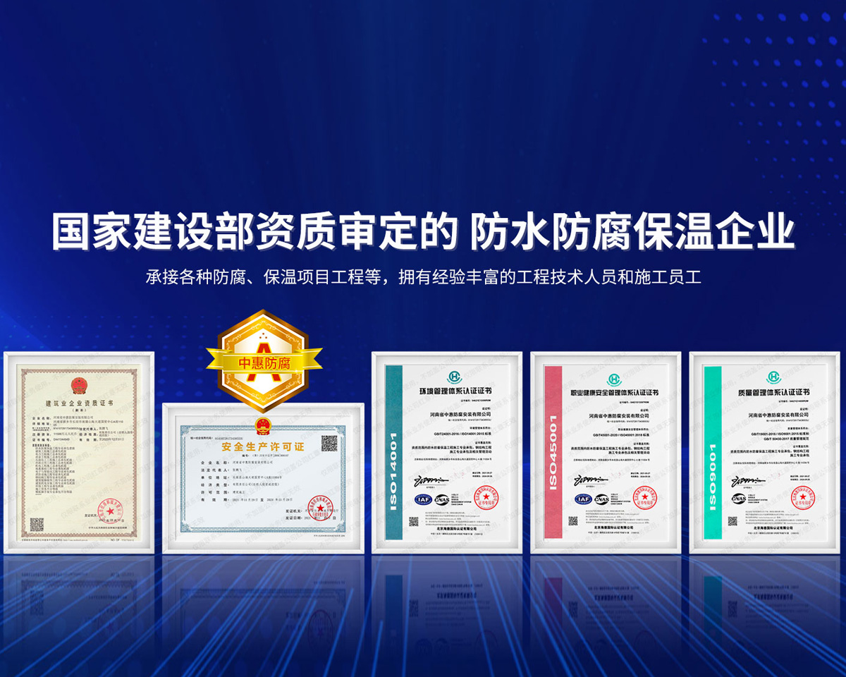 公司經營范圍:防水防腐保溫工程;消防設施工程;建筑裝修裝飾工程;建筑機電安裝工程;電力工程;建筑工程;石油化工工程;工業清洗工程;油罐清洗工程;鋼結構工程;環保工程;模板腳手架工程;電纜防火封堵、防污閃噴涂、外墻外保溫工程;各類施工勞務作業;設備維修、船舶鉚焊、涂裝;電力工程材料、建材、防水材料、防火材料、防腐保溫材料銷售,并相繼通過了GB/T19001-2008idtISO9001:2008GB/T50430-2007質量管理體系認證證書。GB/T24001-2004idtISO14001:2004環境管理體系認證證書。GB/T28001-2011idtOHSAS18001:2007職業健康安全管理體系認證證書。公司是中國防腐蝕于防護協會、中國施工企業管理協會、電力協會和中國鋼結構防水協會會員單位。 公司的經營業務涵蓋了石油、化工、電力、冶金、煤炭、船舶、國防、燃氣、水利、環保、交通運輸、航空及國防軍工和輕紡市政等行業的防腐保溫絕熱設備。鋼結構安裝、防火、防水、金屬噴鍍、聚脲噴繪、陰極保護、防滲透堵漏、玻璃鋼及各種磚版材料襯里、橡膠襯里、煙氣硫和耐酸溶劑腐蝕等工程施工。公司連續十年榮獲“省市先進施工企業”“安全生產先進單位”“重合同,守信用企業”和“AA***資質企業”的稱號。2000年被命名為市級文明單位,2002年被國家工商行政管理局命名為“重合同,守信用的企業”、被中國工業防腐蝕技術協會命名為“防腐蝕企業,能源節約及環境保護領域有豐富的經驗和***的業績。工程一次交驗合格率100%。其中攀枝花鋼鐵公司煉鐵廠四號高爐及熱風爐防腐工程、上海寶鋼公司煤氣柜防腐工程、撫順石油一廠裝置防腐項目、齊魯石化公司稀烴廠高塔防腐工程、吉林化學工業公司煉油廠油罐防腐工程、天津石化熱電廠六號爐頂棚聯絡管保溫工程、大慶油田(太倉)力神泵業工程、中國化學工程第十一建設工程、中原油田勘探局工程、中國石化銷售有限公司華北分部、魯皖輸油管道工程、貴州開磷息烽合成氨工程、陜西黃陵煤化工程、中國石油天然氣西部管道塔里木輸油工程、邯鋼集團邯寶鋼鐵公司煉鐵工程、德州供電工程、吉寶(南通)船廠工程,偃師華潤熱力工程、鄭州熱力總公司。 河南省中惠防腐安裝有限公司愿以豐富的施工經驗,***的技術,***的設備,***的管理,***的服務,竭誠為國內外廣大的用戶提供***滿意、******的工程作品。 我公司愿與國內外同仁一道,團結協作,共同推進防腐蝕行業發展! 公司地址:河南省長垣縣建設路北段360號 固定電話:0373-8866488 郵編:453400 網址:http://www_zhff_com_cn.yinhe33333.com